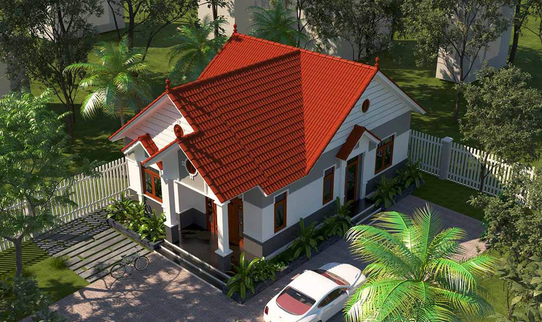 Mẫu biệt thự vườn 1 tầng đẹp thiết kế theo phong cách hiện đại với các đường nét đơn giản, rõ ràng trông vô cùng gọn gàng. Đây chính là đặc trưng của phong cách này. Bằng việc loại bỏ các chi tiết rườm rà chúng tôi nhấn mạnh vào các đường phào chỉ nhẹ nhàng tạo điểm nhấn cho kiến trúc. Mái thái đỏ truyền thống góp phần làm nổi bật toàn bộ kiến trúc và trở thành nét đẹp tiêu biểu của khu vực. Điểm thu hút của mẫu thiết kế này chính là chi phí thiết kế rất rẻ, phù hợp với những đôi vợ chồng trẻ hoặc các gia đình có ít thành viên.