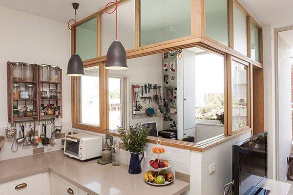 Bàn làm việc tận dụng khoảng hở giữa ban công và nhà bếp, nó ngăn cách với bếp bằng cửa kính để ngăn mùi thức ăn.