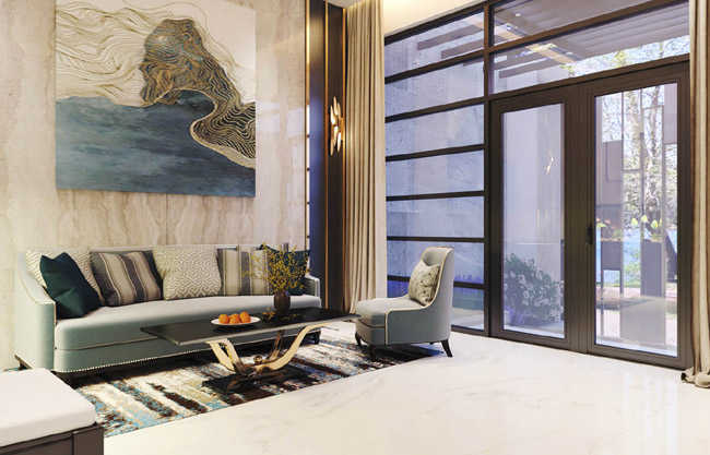 Cửa kính kéo dài từ sàn đến trần tăng cường ánh sáng cho phòng khách biệt thự hiện đại 140m2.