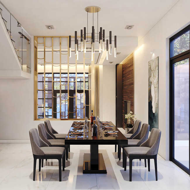 Phòng ăn rộng 15m2 đặt liền kề, ngăn với phòng khách bằng kệ tivi đặt ở giữa.