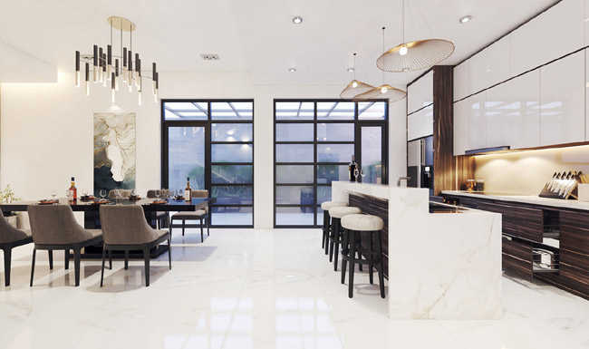 Kiểu sàn giật cấp giúp phân chia khu vực phòng khách với phòng ăn và nhà bế.