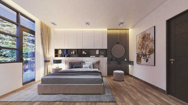 Bao gồm giường và giá kệ, bàn làm việc và một ban công nhỏ. Tủ kệ đặt đầu giường là nơi để đồ trang trí và những quyển sách mà gia chủ đang đọc dở.