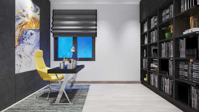 Phòng làm việc gồm một chiếc bàn làm việc mặt kính và ghế sofa màu vàng hiện đại.