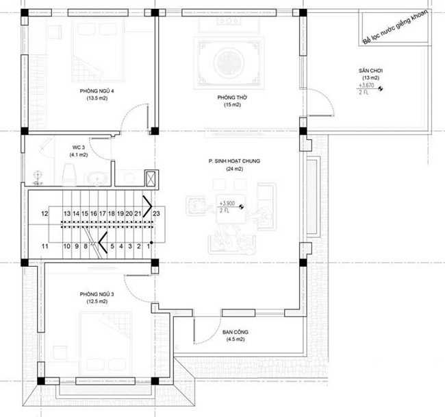 Tầng 2 gồm: Phòng ngủ 3, phòng ngủ 4, phòng sinh hoạt chung, phòng thờ, sân chơi