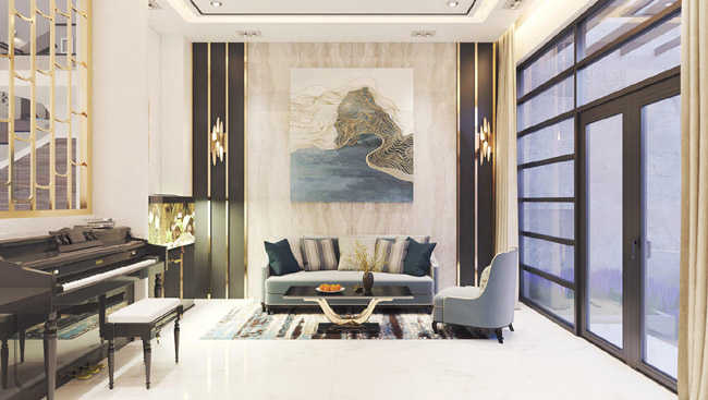 Một phòng khách rộng 24m2 là nơi gia chủ tiếp đại bạn bè và đối tác làm ăn.