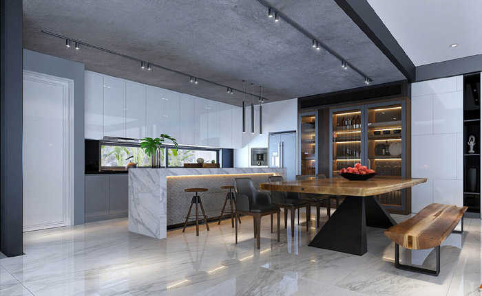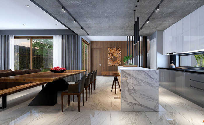 Khu vực cuối căn biệt thự phố tuyệt đẹp được dành trọn vẹn cho phòng bếp và bàn ăn.
