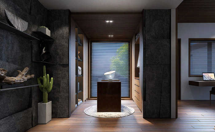 Cạnh phòng ngủ là phòng thay đồ nhìn ra khu vườn bên ngoài nên không gian phòng này khá thông thoáng.