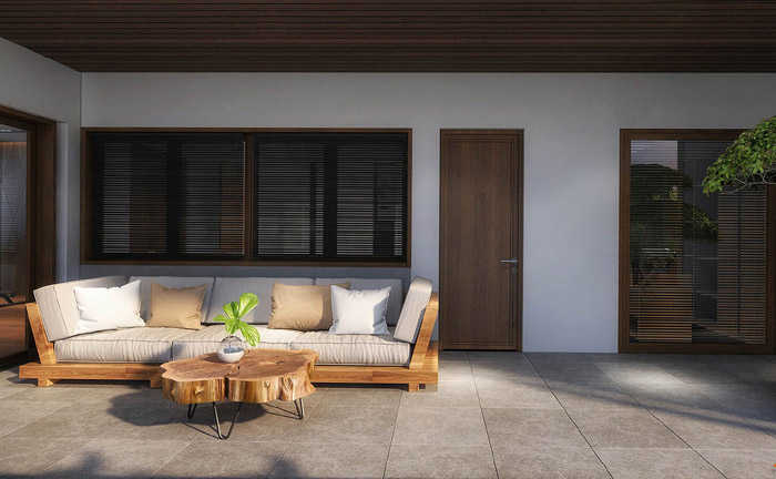 Một bộ bàn ghế sofa đặt cạnh ban công nhìn ra khu sân thượng phía trước.