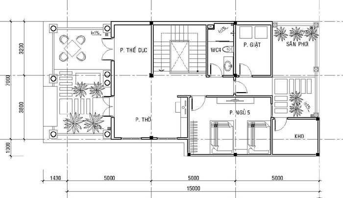 Tầng 3 gồm: Phòng thể dục, phòng thờ, phòng ngủ 5, phòng giặt, sân phơi, kho