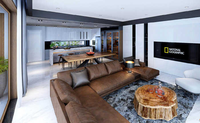 Phòng khách bố trí liền kề và có thiết kế mở, gần gũi với tự nhiên theo đúng sở thích của con trai chủ biệt thự hiện đại cao cấp.