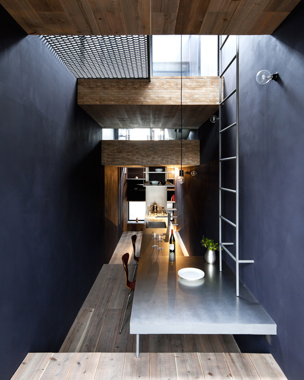 Nhà được chia thành 4 tầng có những không gian thông với nhau để tạo độ rộng rãi và tránh sự ngột ngạt, bí bách. Bức tường sơn xám và gỗ ốp sàn nhà màu vàng sẫm vừa phải tạo nên cảm giác ấm cúng cho toàn ngôi nhà.