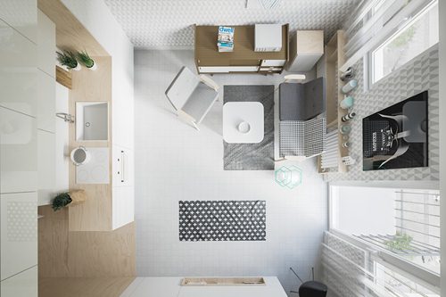 Phòng tắm nhỏ hẹp nhưng dài với những vật dụng tiện dụng.