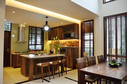Khu vực bếp và bàn ăn mang hơi thở hiện đại nhưng vẫn mang lại cảm giác ấm cúng cho ngôi nhà. Nội thất mang phong cách hiện đại sẽ thiên về những thiết kế tối giản. Bề mặt trơn nhẵn, những chi tiết chạm khắc hay hoa văn cầu kỳ sẽ bị hạn chế. Chú trọng vào kiểu dáng góc cạnh, hình khối lịch lãm, mạnh mẽ. Có thể tận.dụng tối đa công năng và tiết kiệm diện tích.